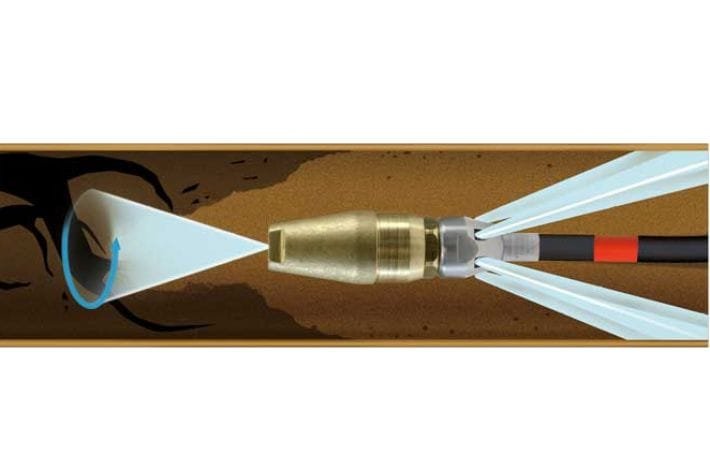 The nozzle cleans the pipe as it moves backward, pulling itself along, with a rotary nozzle at the front.